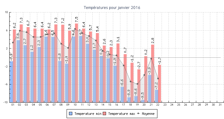 | 22 | -7.2 °C | -1.6 °C | -4.5 °C | 1.0 km/h (16.2 km/h) | S |