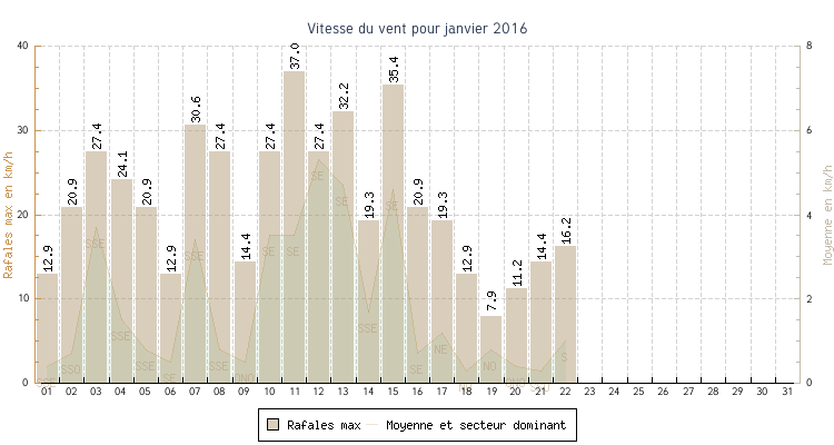 | 01 | -0.9 °C | 6.2 °C | 3.3 °C | 0.4 km/h (12.9 km/h) | SSE |